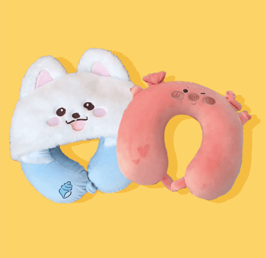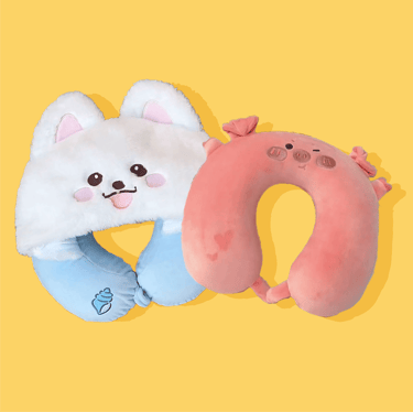 Travel-friendly neck pillows with plush character covers, offering comfort and brand visibility on the go. Perfect for travel sets, events, or retail merch.